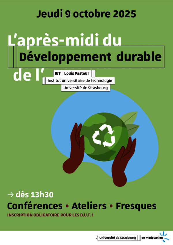 L'IUT Louis Pasteur de Schiltigheim organise une après-midi du développement durable à destination de l'ensemble des étudiants de première année le jeudi 9 octobre, de 13h30 à 18h.