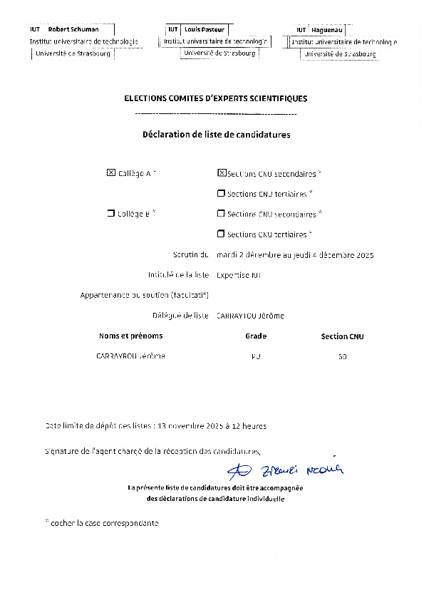 Les élections générales des Comités d’experts scientifiques communs aux IUT de l’Université de Strasbourg - l’IUT Louis Pasteur, l’IUT Robert Schuman et l’IUT de Haguenau – portant sur les disciplines relevant des sections CNU secondaires et tertiaires, se tiendront du mardi 2 décembre au jeudi 4 décembre 2025 par voie électronique.