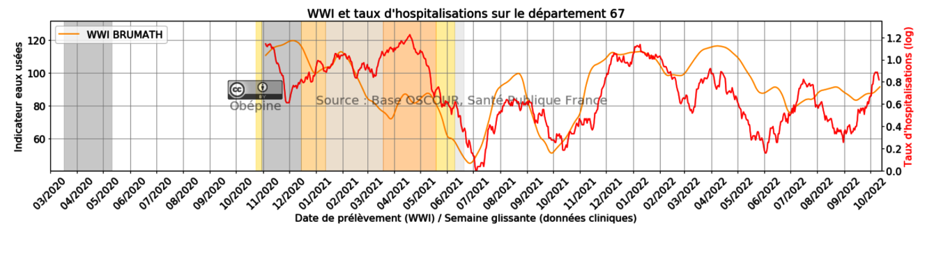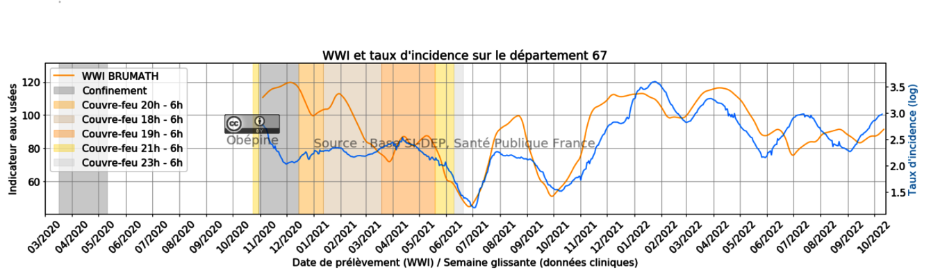 Wastewaters are currently studied as low cost and predictive indicators of pathogen emergences in populations. As part of the OBEPINE consortium, our lab analyses the wastewater from 11 wastewater treatment plants in Alsace. Our weekly-based epidemiologic survey that currently focused on SARS-CoV2 covers 400 000 persons and is representative to the region population (cities, villages, hospitals, industries …etc).