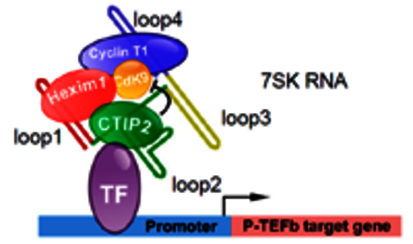 As state above, active positive transcription elongation factor b (P-TEFb) is essential for cellular and human immunodeficiency virus type 1 (HIV-1) transcription elongation. CTIP2 represses P-TEFb activity in a complex containing 7SK RNA and HEXIM1. The inactive 7SK/P-TEFb small nuclear RNP (snRNP) has been detected at the HIV-1 core promoter as well as at the promoters of cellular genes, but a recruiting mechanism still remains unknown to date. In this article, we have shown global synergies between CTIP2 and the 7SK-binding chromatin master-regulator HMGA1 in terms of P-TEFb-dependent endogenous and HIV-1 gene expression regulation. In addition, chromatin immunoprecipitation experiments revealed a significant loss of CTIP2/7SK/P-TEFb snRNP recruitment to cellular gene promoters and the HIV-1 promoter on HMGA1 knock-down. Our findings not only provide insights into a recruiting mechanism for the inactive 7SK/P-TEFb snRNP, but also contribute to a better understanding of viral latency.
